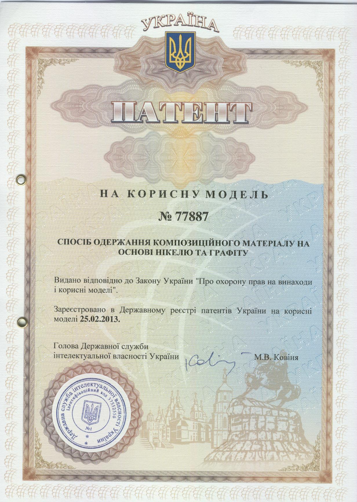 Пат. на корисну модель 77887 Україна, МПК B21D 26/14. Спосіб одержання композиційного матеріалу на основі нікелю та графіту / П. А. Козуб, Т. А. Довбій, С. М. Козуб, І. О. Черніков, заявник та власник П. А. Козуб ; № u201211334, заявл. 01.10.2012 ; опубл. 25.02.2013, Бюл. № 4.