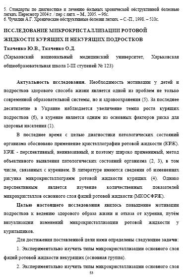 Ткаченко Ю. В. Исследование микрокристаллизации ротовой жидкости курящих и некурящих подростков / Ю. В. Ткаченко, О. Д. Ткаченко // Новейшие аспекты научных исследований начала XXI века : сборник научніх трудов / под общ. ред.: О. П. Чигишевой, Е. Н. Морозовой ; Междунар. исслед. центр «Научное сотрудничество. – Ростов-на-Дону, 2012. – Ч. 2. ‒ С. 53‒60.
