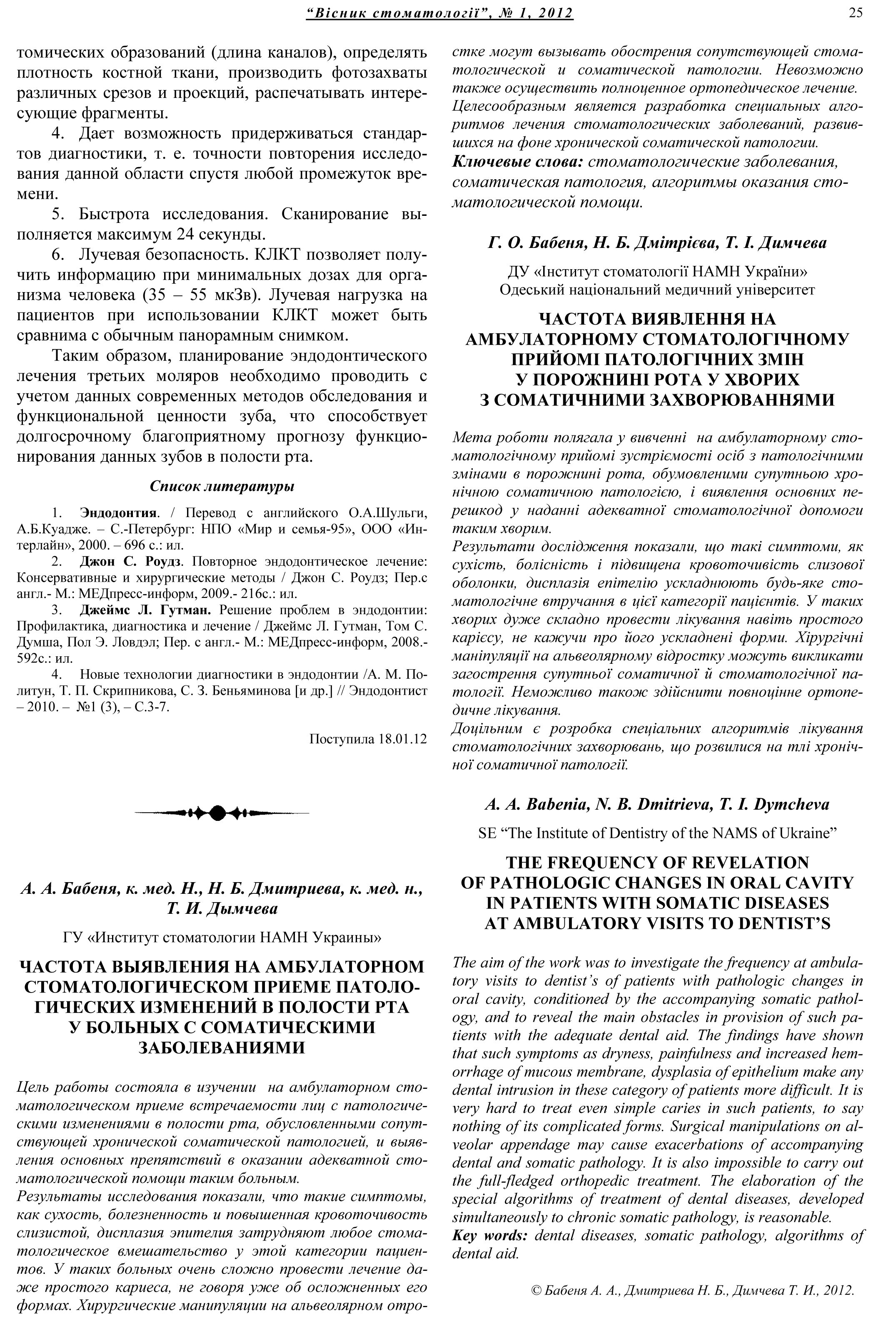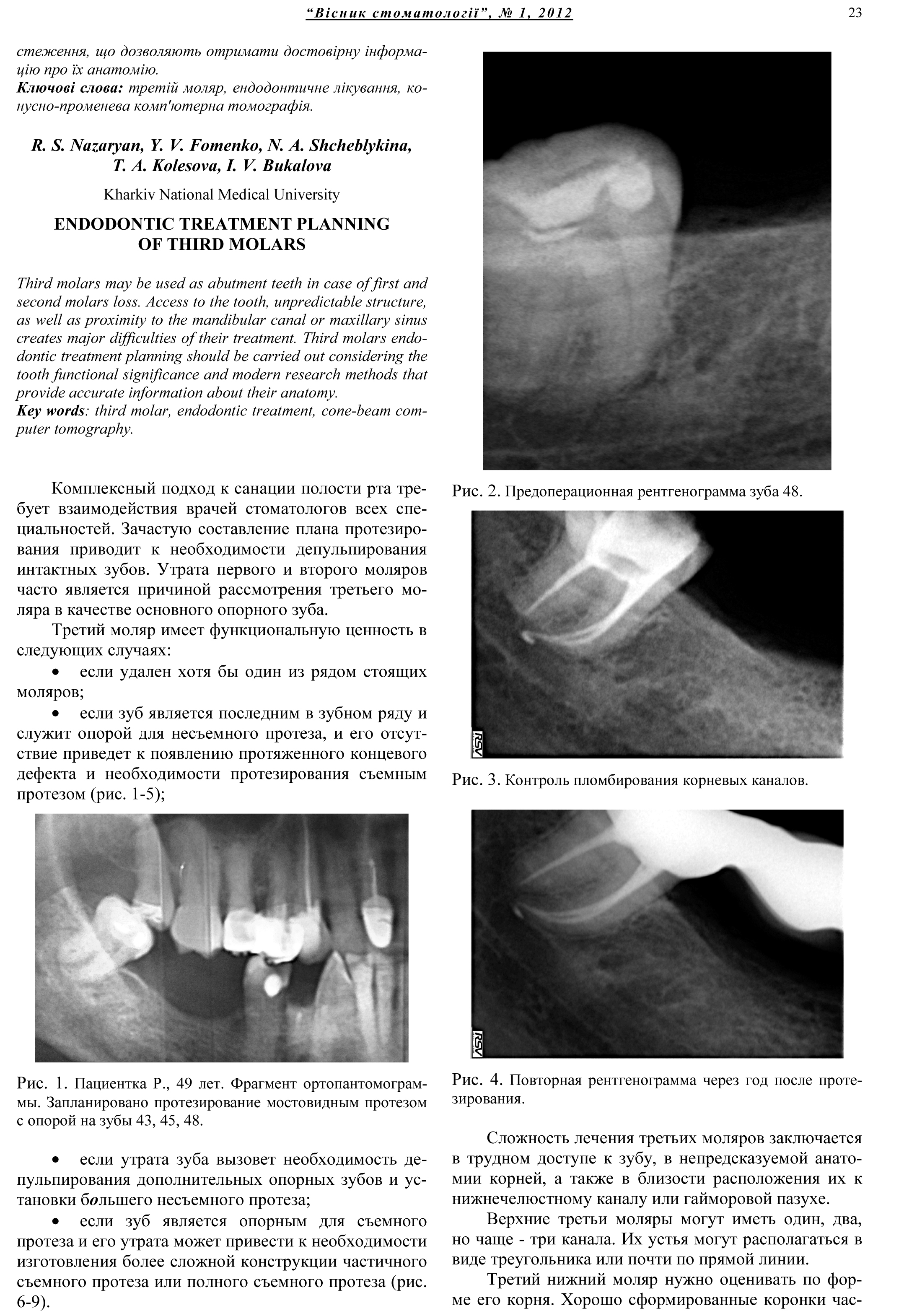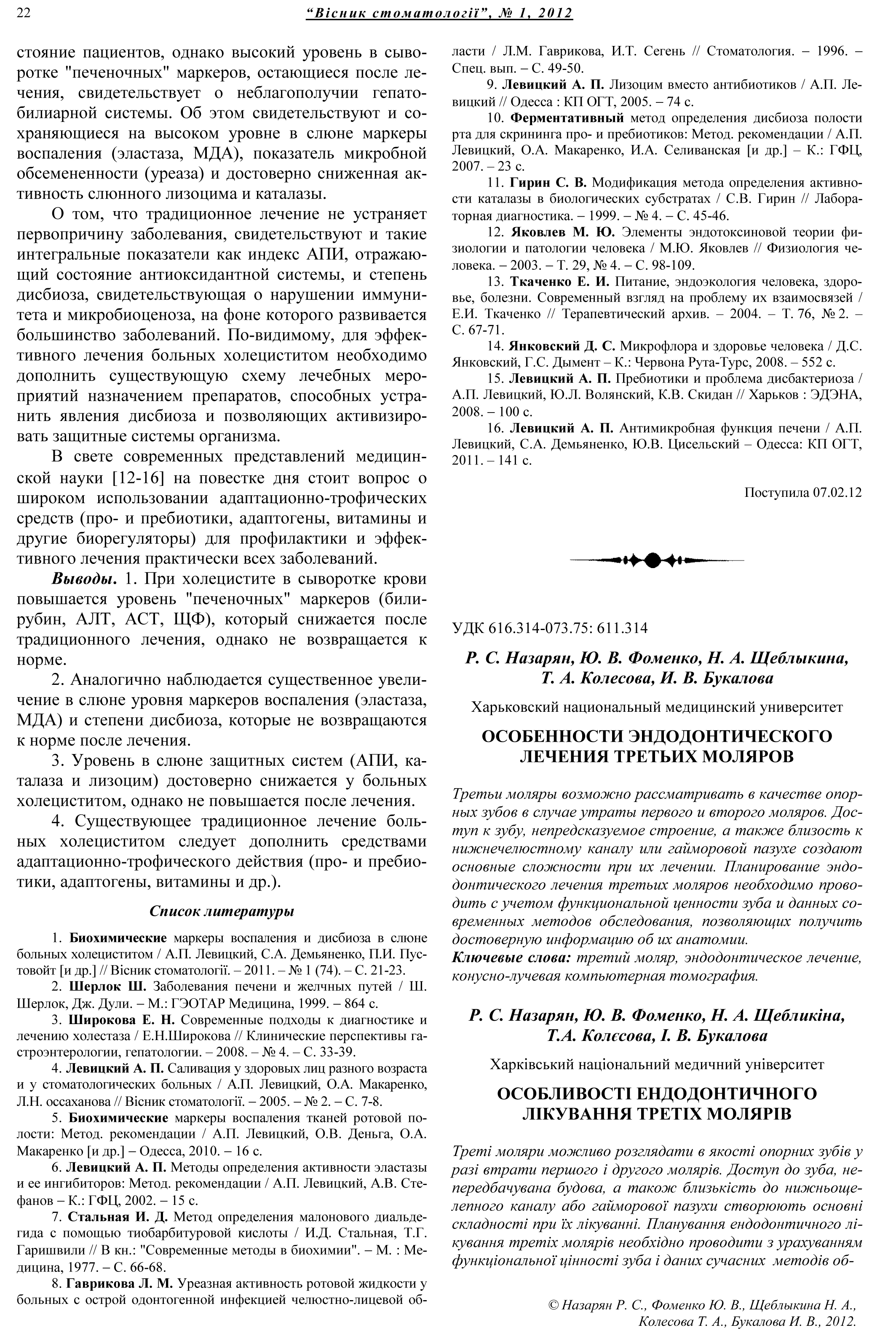 Особенности эндодонтического лечения третьих моляров / Р. С. Назарян, Н. А. Щеблыкина, Т. А. Колесова, Ю. В. Фоменко, И. В. Букалова // Вісник стоматології. – 2012. – № 1 (78). – С.22–25.