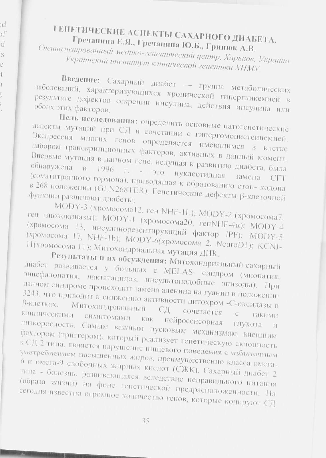 Гречанина Е. Я. Генетические аспекты сахарного диабета / Е. Я. Гречанина, Ю. Б. Гречанина, А. В. Гринюк // Цукровий діабет як інтегральна проблема внутрішньої медицини : матеріали науково–практичної конференції з міжнародною участю, м. Харків, 12 вересня 2013 р. / Міністерство охорони здоров'я України, Харківський національний медичний університет, Департамент охорони здоров'я Харківської областної державної адміністрації, Комунальний заклад охорони здоров'я "Обласна клінічна лікарня – центр екстреної медичної допомоги та медицини катастроф" м. Харкова. – Харків, 2013. – С. 35–36.