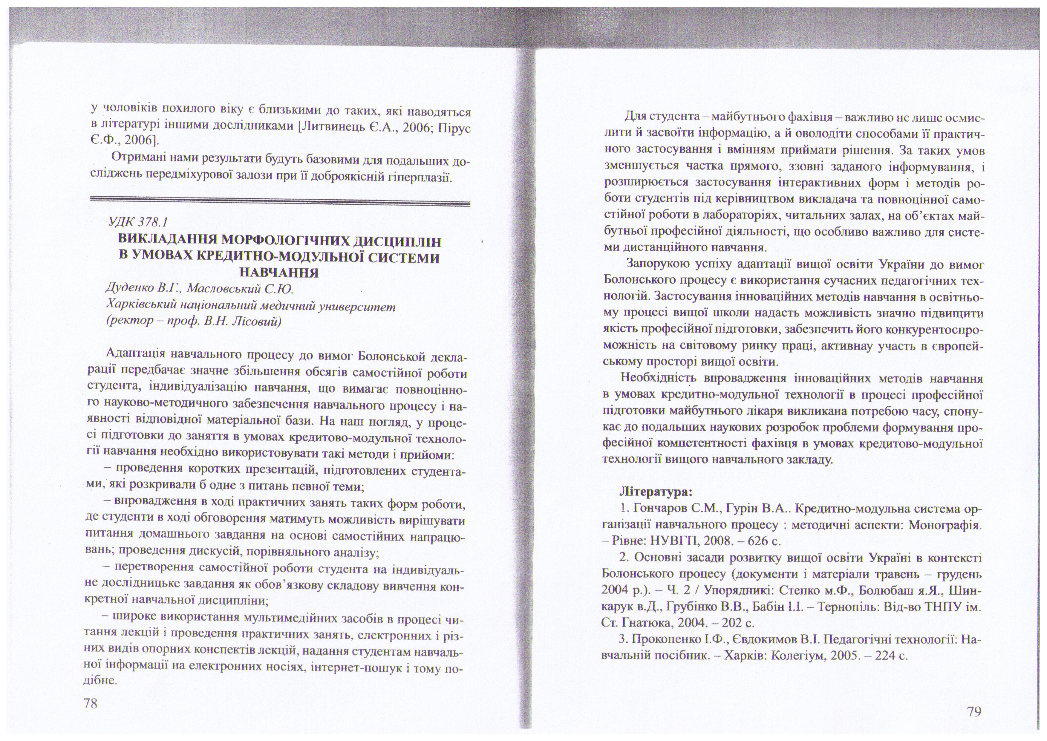 Дуденко В. Г. Викладання морфологічних дисциплін в умовах кредитно–модульної системи навчання / В. Г. Дуденко, С. Ю. Масловський // Морфофункціональні особливості нервової та серцево-судинної системи у нормі, експерименті та патології : збірник тез науково-практичної конференції, Івано-Франківськ, 10–11 жовтня 2013 р. – Івано-Франківськ, 2013. – С. 78–79.