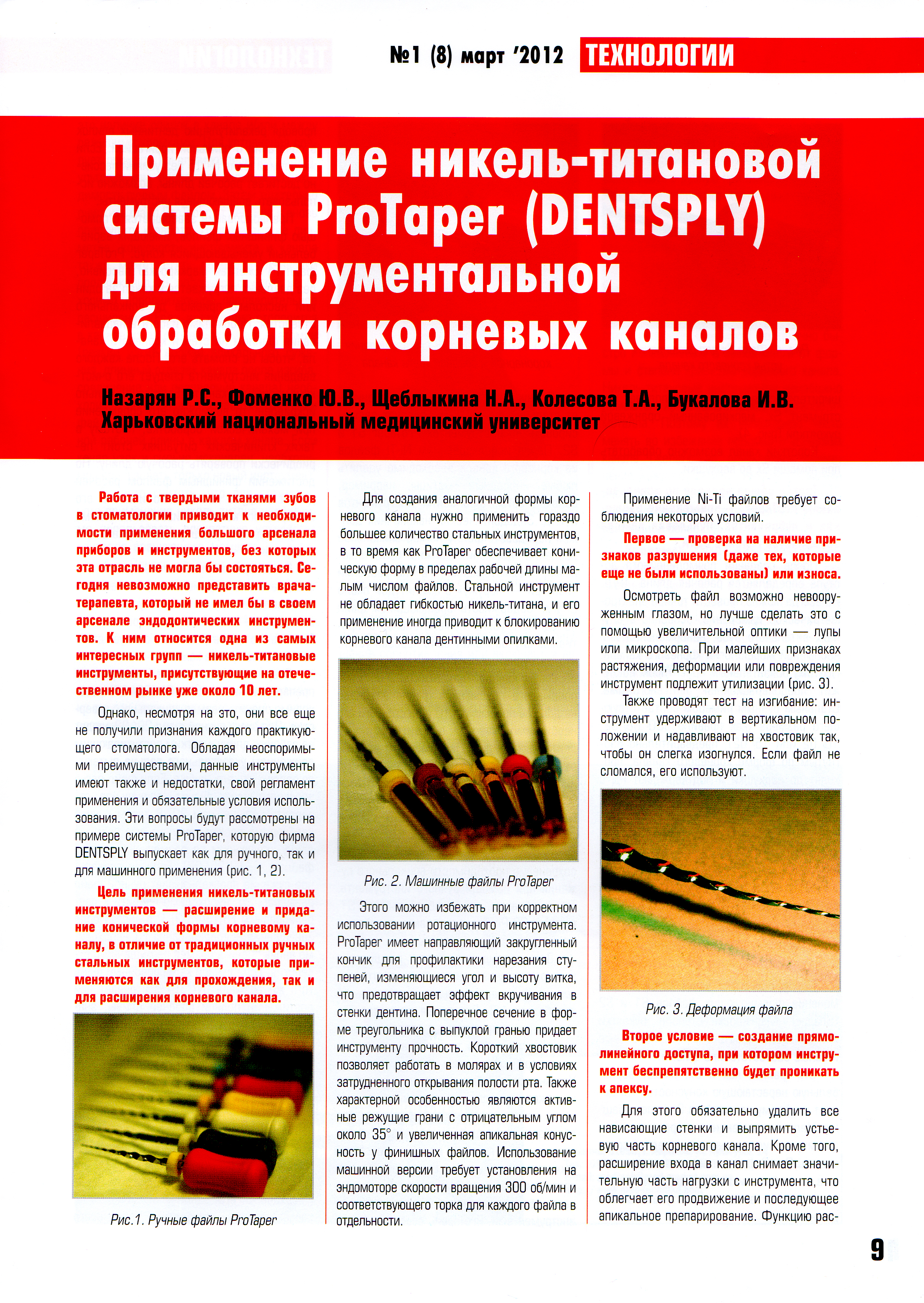 Применение никель-титановой системы ProTaper (Dentsply) для инструментальной обработки корневых каналов / Р. С. Назарян, Н. А. Щеблыкина, Т. А. Колесова, Ю. В. Фоменко, И. В. Букалова // Медицинская техника и стоматология. – 2012. – № 1 (8). – С. 9–11.