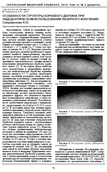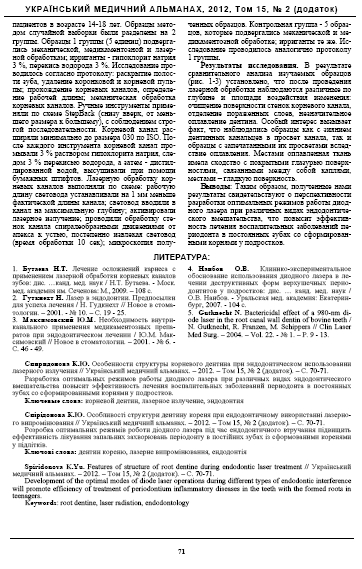 Спиридонова К. Ю. Особенности структуры корневого дентина при эндодонтическом использовании лазерного излучения / К. Ю. Спиридонова // Український медичний альманах. – 2012. – Т. 15, № 2. – С. 70–71.
